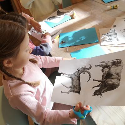 Im Atelier verwandeln wir unsere Beobachtungen in Bilder, Skulpturen und Masken. Wir experimentieren mit Farben, Naturmaterialien und Ton, wir bauen Höhlen, Nester und Fantasietiere. Wir bewegen uns wie Tiere, wir tanzen ihre Gesten, wir lauschen ihren Stimmen und verwandeln sie in Klanggeschichten.